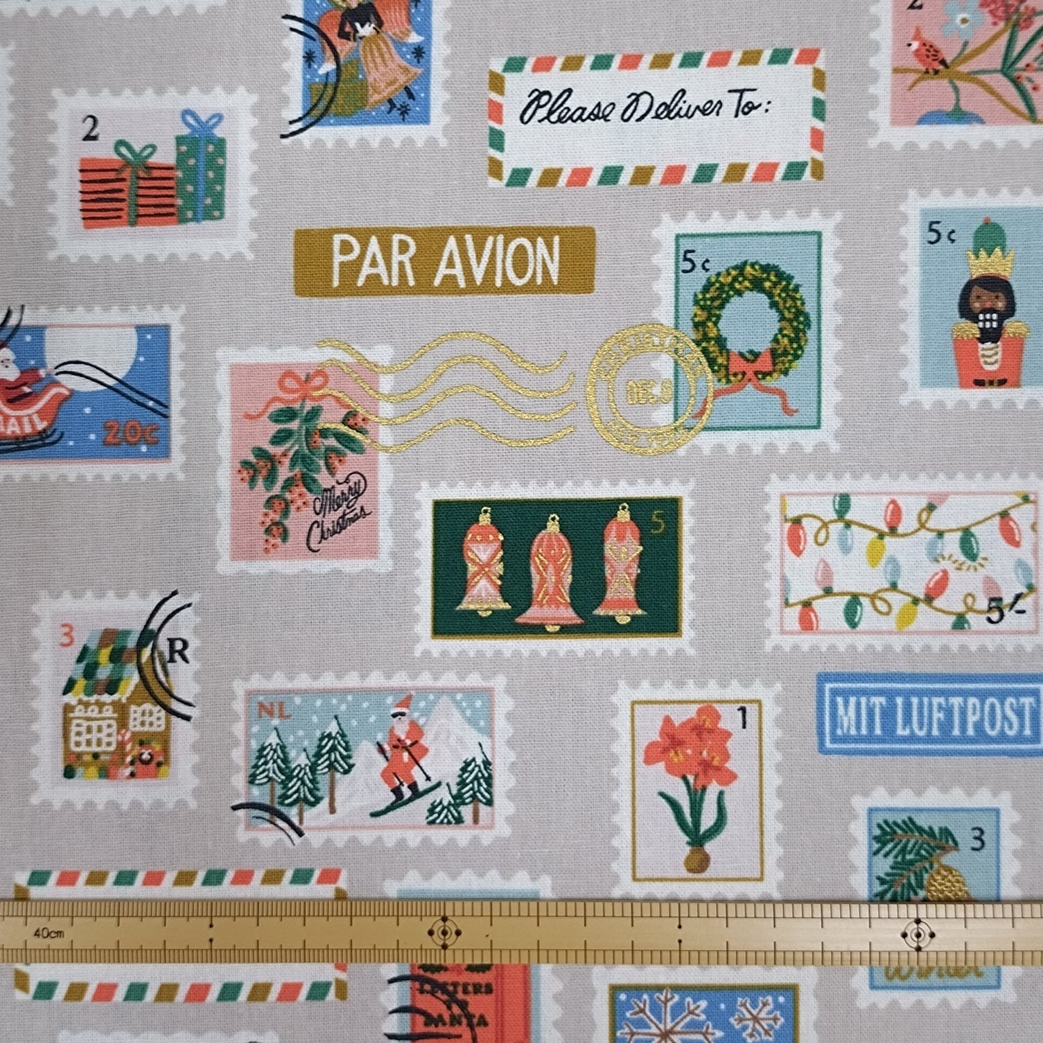 COTTON +STEELの切手モチーフ柄が描かれている生地です